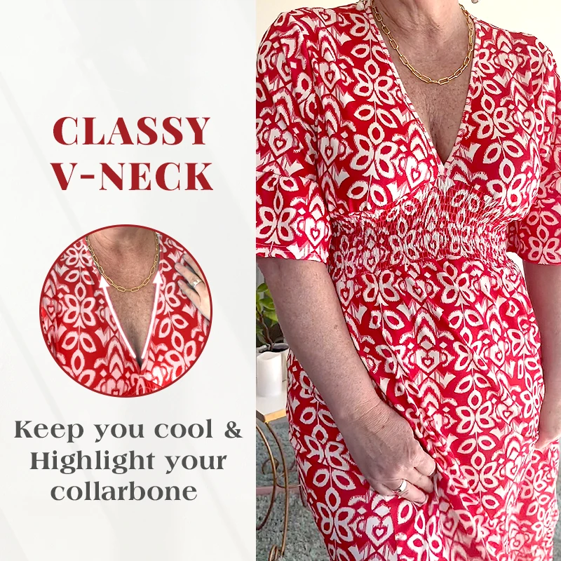 Mit einem V-Ausschnitt und einer entspannten Brustpartie gestaltet, bietet dieses Kleid eine bequeme und schmeichelhafte Passform. Der leichte Stoff verstärkt das luftige Gefühl und macht es zu Ihrer ersten Wahl für windige Tage und Nächte.