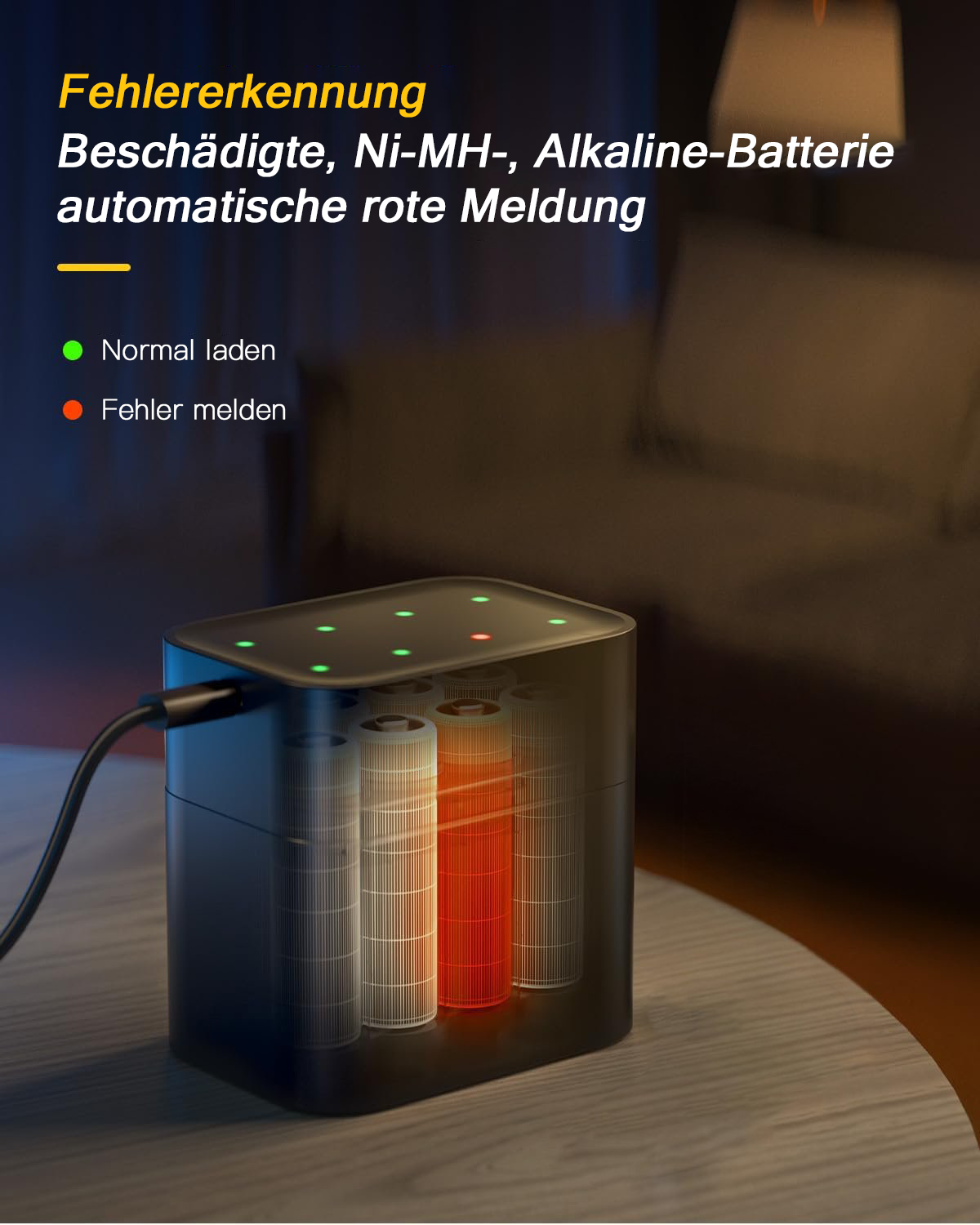 【Intelligentes LED-Display】Die LED-Anzeige zeigt den Ladestatus an. Blinkendes Grün bedeutet, dass geladen wird, konstantes Grün bedeutet vollständig geladen, Rot weist auf eine fehlerhafte Batterie oder einen Temperaturzustand hin. Wiederaufladbare 1,5V AA/AAA Lithium-Batterien erreichen in 4 Stunden den Zustand des konstanten Grüns und sind dann vollständig geladen.
