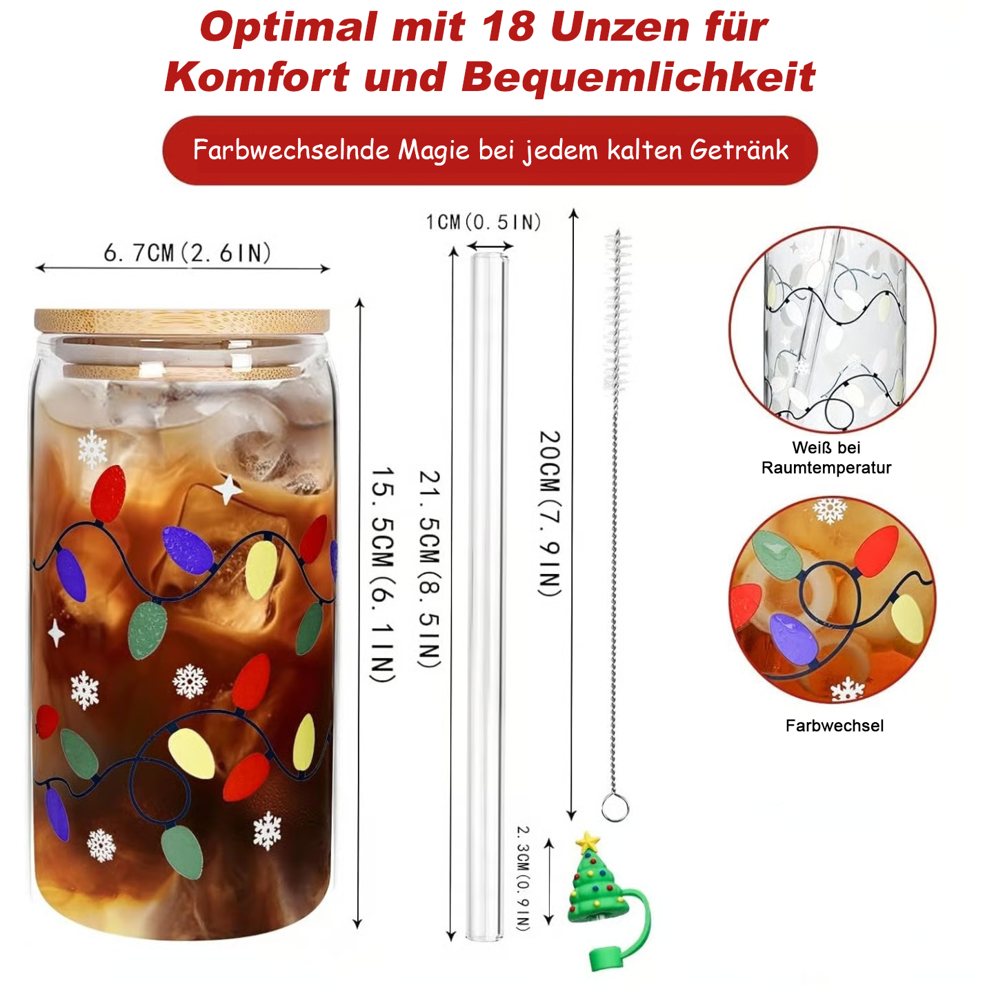 Die perfekte Größe von 18 Unzen für Eiskaffee, Smoothies, Cocktails oder festliche Punschgetränke. Inklusive einem wiederverwendbaren Glasstrohhalm und einem niedlichen Strohhalm-Charme für extra festlichen Flair.